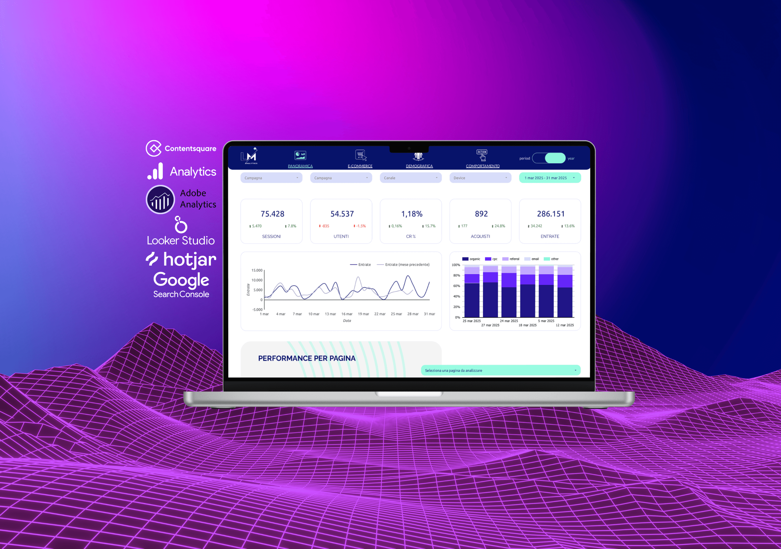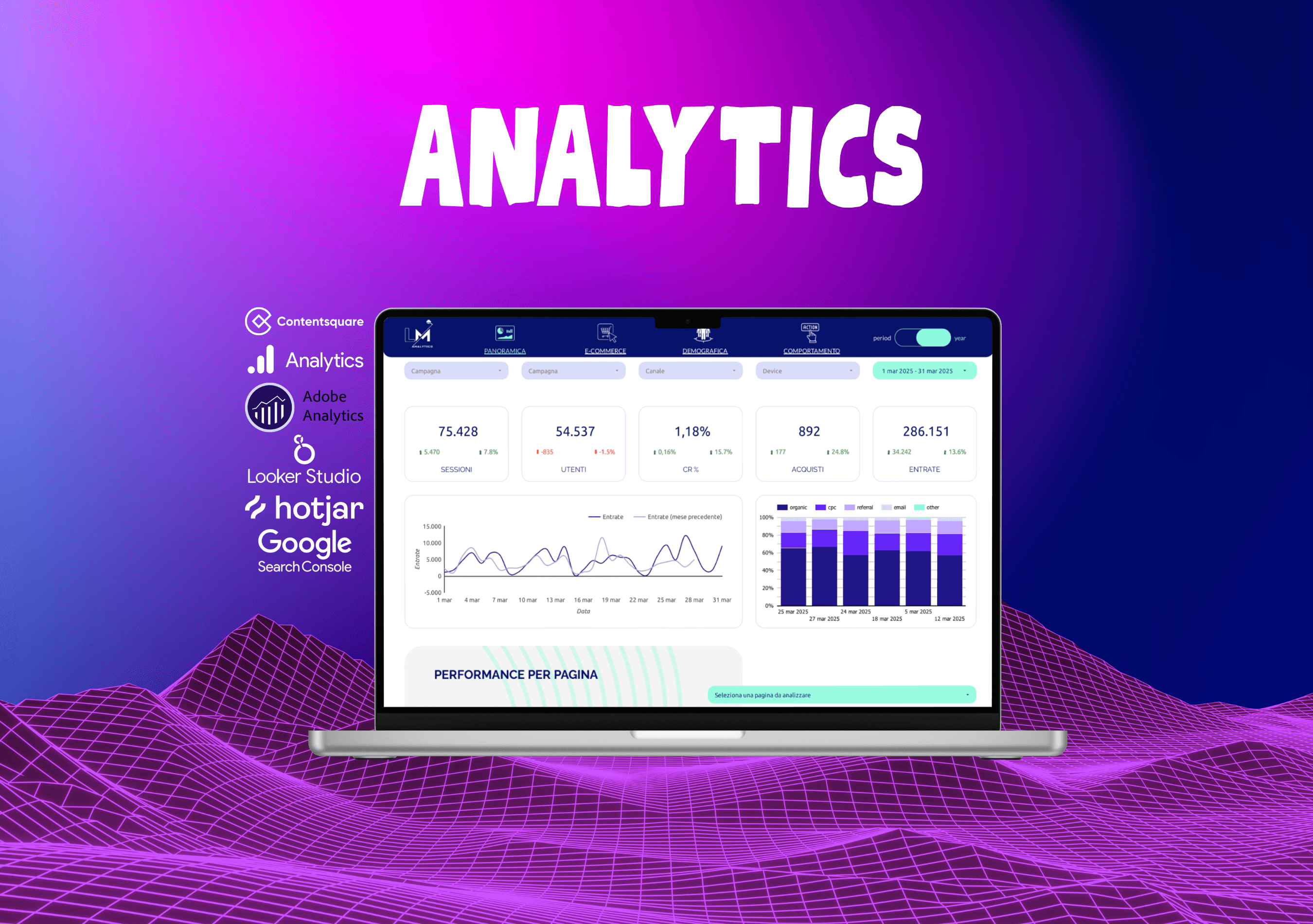A seconda dell'esigenza, potrai avere un pacchetto di dashboard in Looker Studio o Adobe, appuntamenti mensili in cui analizzeremo insieme i dati e analisi comportamentali in Hotjar, Clarity o Contentsquare.